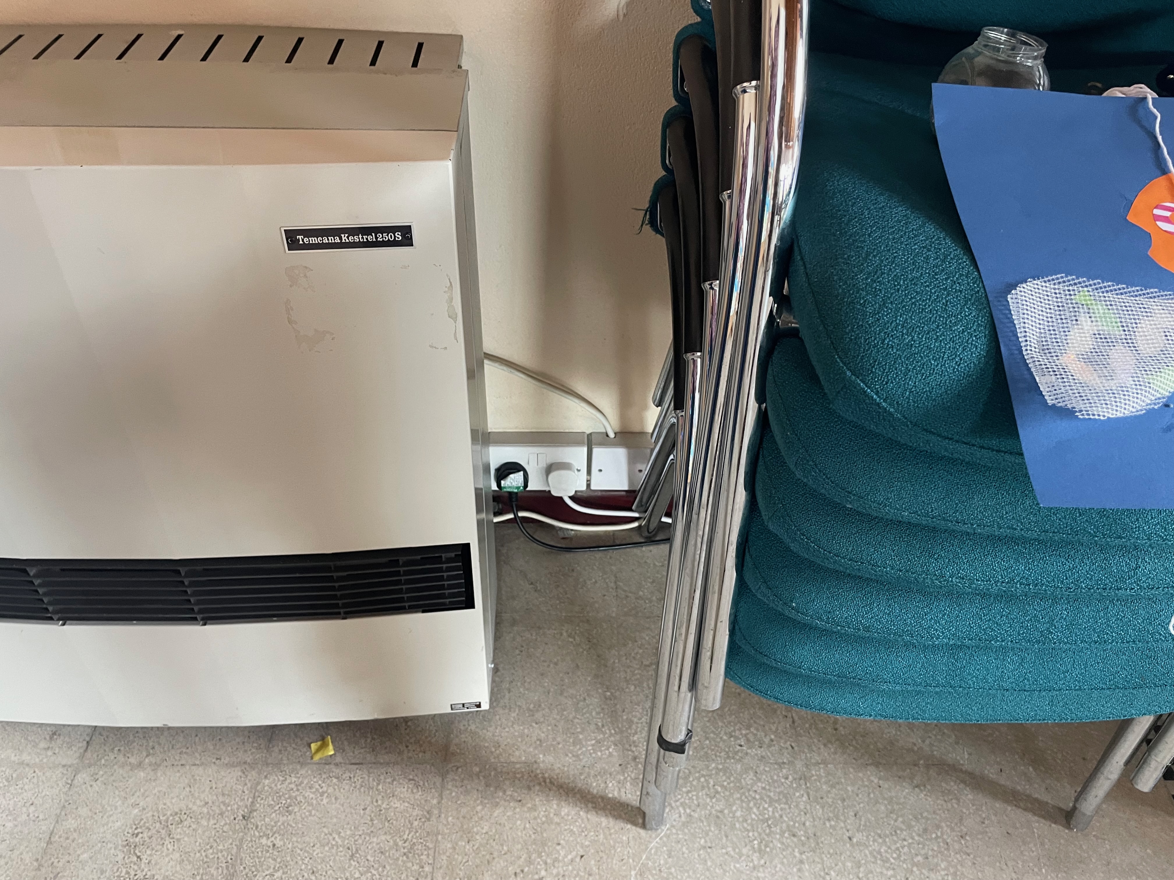 Plugs are located next to the pillar in front of the desk. Plug them in and turn them on.